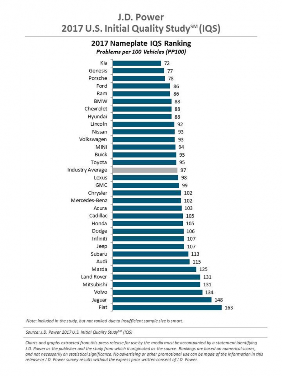کیا موفق به ثبت کمترین آمار خرابی برای دومین سال پیاپی شده است. جنسیس، برند لوکس هیوندای جایگاه دوم را به خود اختصاص داده است و پس از آن، پورشه و فورد در ردههای سوم و چهارم قرار دارند. مینی نیز بیشترین بهبود را در ردهی کیفیت محصولات خود تجربه کرده است. محصولات این برند در سال ۲۰۱۷ در هر ۱۰۰ خودرو ۳۳ عیب کمتر نسبت به سال ۲۰۱۶ داشتند. رَم، آکورا، ولوو و فورد پس از مینی بیشترین ارتقاء کیفیت را به همراه داشتند.